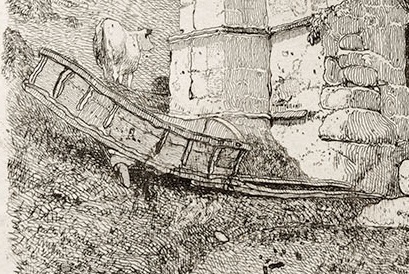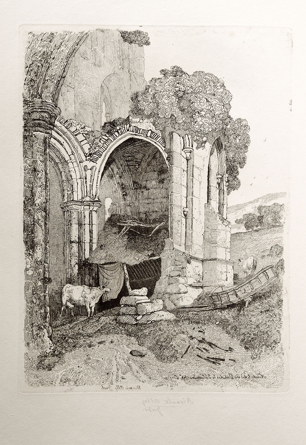 This is an impression of a copper-plate etching of an upright architectural subject featuring the remains of a vaulted Gothic chapel attached to a much taller structure beyond to the right. The chapel serves as a cow-byre and has a disintegrating thatched shelter within. A cow stands before the byre to the right, and a cart has been stripped of its wheels and abandoned to the left. The composition opens out at the left with a distant hill and a cow standing before the field in the middle distance.