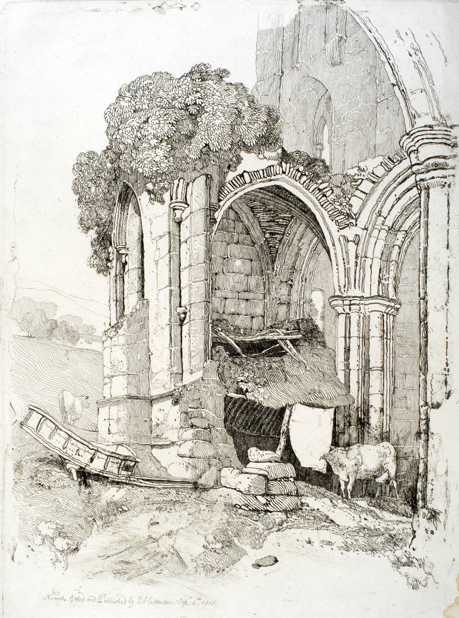The plate was etched by Cotman and dated 4 September 1810 for his first series of ‘Etchings by John Sell Cotman’. This was issued to subscribers in parts, and the present subject was published as plate 8 in the complete edition as published in 1811. It is the first of the large plates in date order and the third of all the published plates (following only The Manor House, York and South Burlingham Church) and dated only a few weeks after his very first adventures into etching in June 1810.