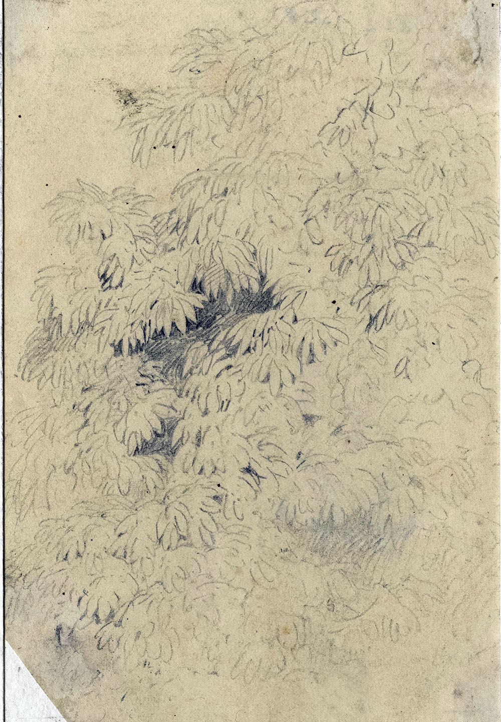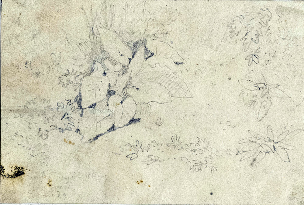 Another example at Norwich Castle Museum caused Miklos Rajnai to observe ‘The curious leaf forms, splodges tending towards triangular or heart shapes, which appear as early as 1803 in drawings such as Rievaulx Abbey in the Tate, become a recurring motif in the later watercolours.. Cotman’s acute observation in the field did no wane; he continued to make small intimate studies of plants. A collection of these in the V&A includes one which is copiously inscribed with colour notes and is dated 26th May 1823 [E662-1925].’ The Leeds collection includes examples dated to 1822. Clearly this aspect of Cotman’s practice might reward some more extended scholarly scrutiny.