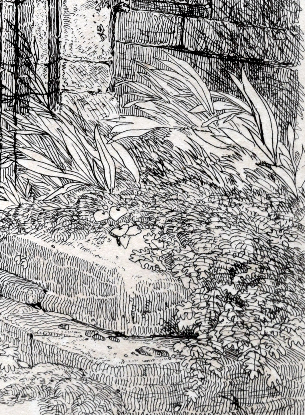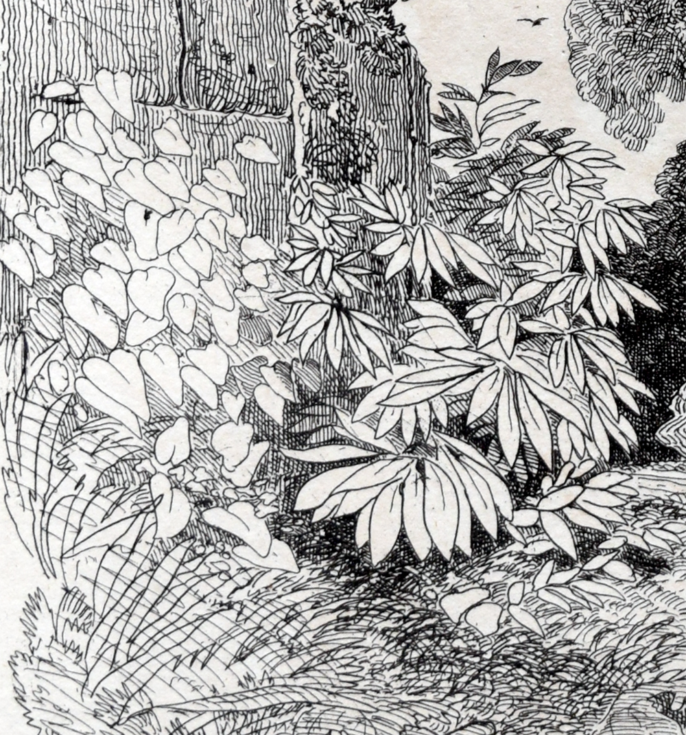 The preceding sentence of the letter comments that Croyland Abbey is ‘Wonderful – there is not one upright line in the composition therefore let not the Botanists criticise when they come to see it if[?] they find me out of the perpendicular’. The ‘Botanists’ must be an allusion to Dawson Turner’s party whom Cotman had hoped to meet at Croyland, but the observation is significant for his particular appreciation of irregularity in pre-Renaissance architecture. His views anticipate those made famous by Ruskin half a century later in his book Stones of Venice. Later in the letter he dismisses Peterborough Cathedral: ‘Peterbro’ is too perfect for my pencil every architect can make a better Drawing from that than I can’. As he also says in the letter, he prefers to concentrate on details, door and windows; details of more modest scale and calculation. The leaves, only some of which achieve orthogonal regularity ‘with the Stalks perpendicular & the Leaf Horizontal’, generally assume form on more natural principles. Translated into his etching these forms express observation of nature, and demonstrate a certain vegetal esotericism. In short, a kind of herbaceous graffiti signature.