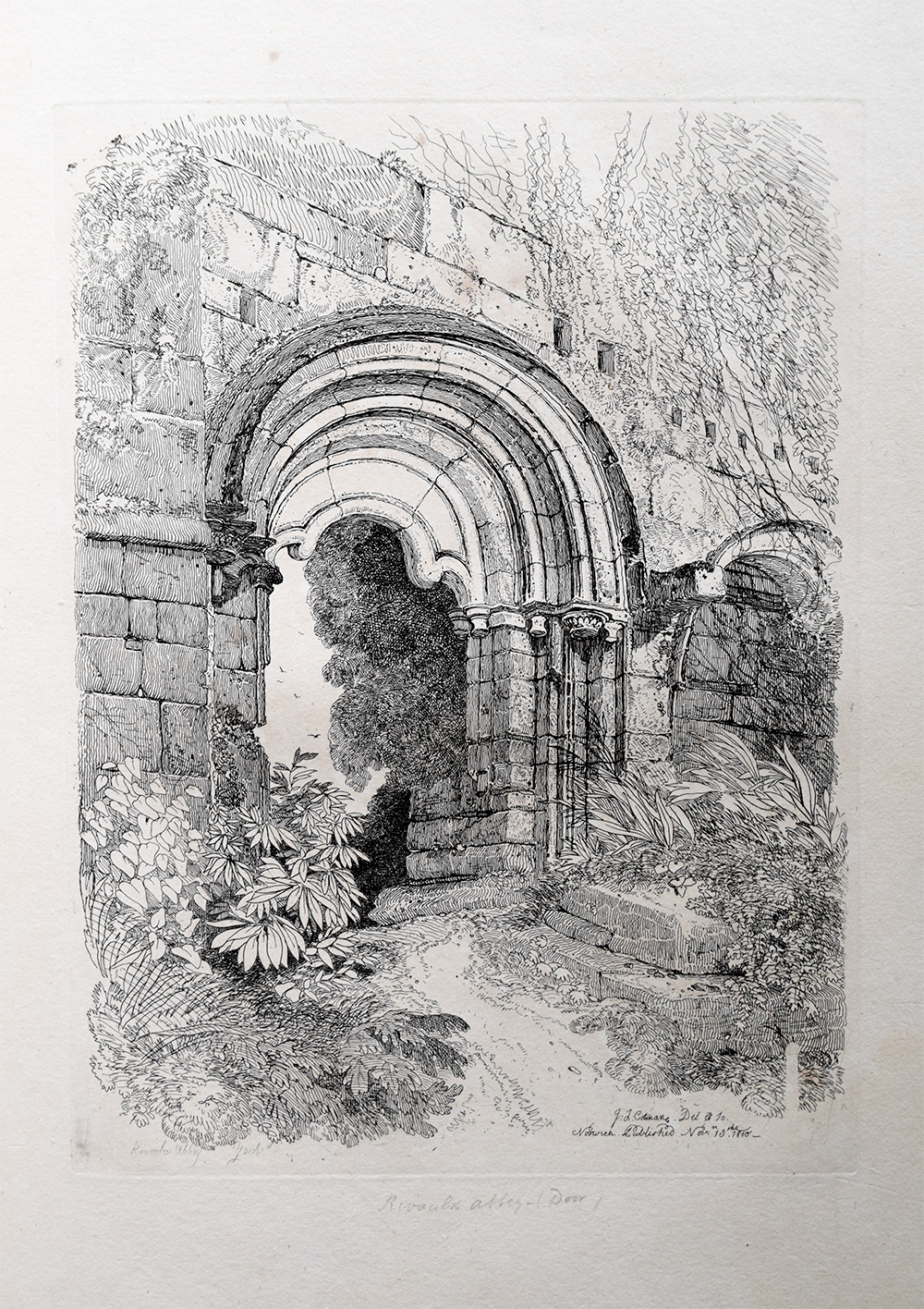 Inscribed on plate lower right ‘J S Cotman Del et Sc/ Norwich, Published Novr 13th 1810’ and lower left (much more faintly) ‘Rivaulx Abbey Yorks’. Author’s copy inscribed by the artist in lower margin in pencil, as called for in the printed list of subjects: ‘Rivaulx Abbey (Door)’
