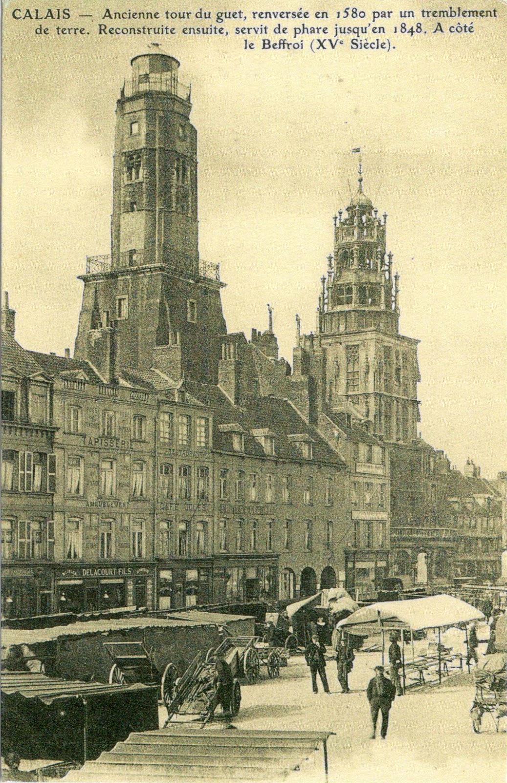 The central building in the composition is the Tour du Guet. This was built as a watchtower in the 13th century, and latterly served as a lighthouse from 1818 until 1848 when a new lighthouse was built some distance further east. It survived when most of the old town was destroyed by bombing in May 1940. It remains as the principal building in the Place d’Armes, albeit somewhat gaunt and bare.
