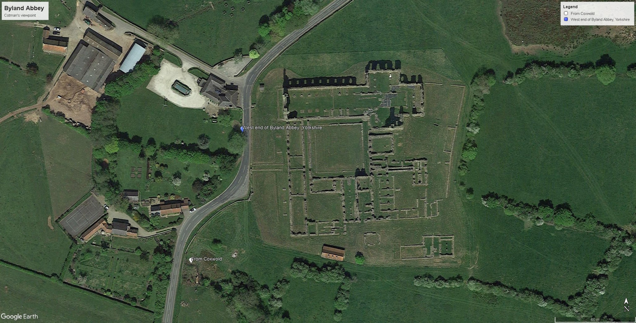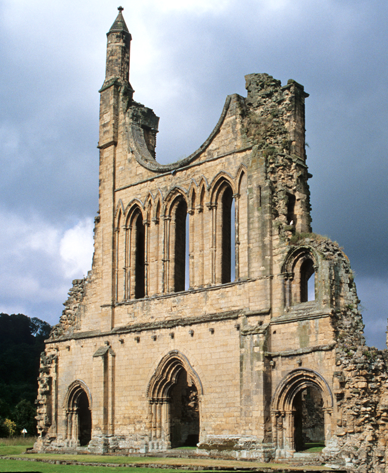 Byland Abbey is about twenty miles north of York, a mile and a half beyond the village of Coxwold. An itinerant community of Savigniac monks settled here as members of the Cictercian family in about 1150, and developed the site and great church over the next forty years. Upon its completion it was over 100m long, and the largest in the country. At its height it rivalled its fellow Yorkshire Abbeys Rievaulx and Fountains in power and wealth. Started slightly later than those, it was also the more modern in style, representing the transition from the Romanesque rounded arch to the pointed Gothic.