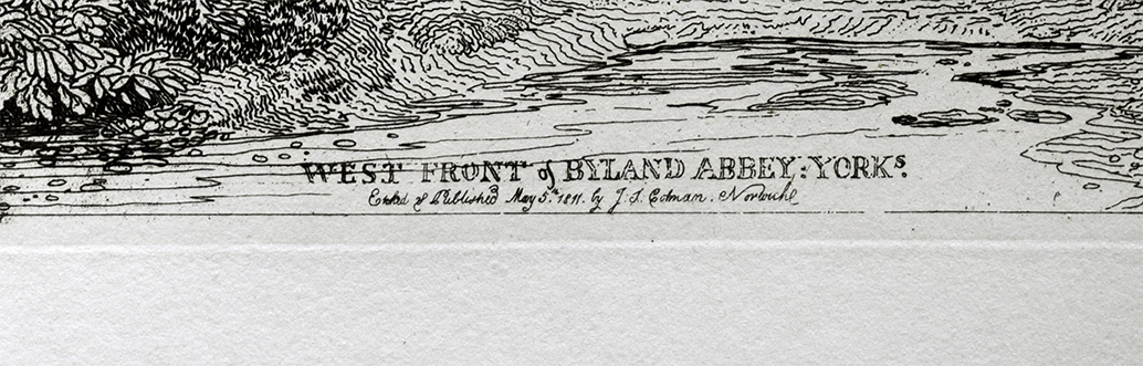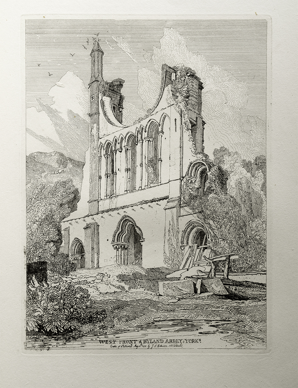 On plate bottom centre of subject WEST FRONT of BYLAND ABBEY: YORKS/ Etched & Published May 5th 1811 by J S Cotman, Norwich’.