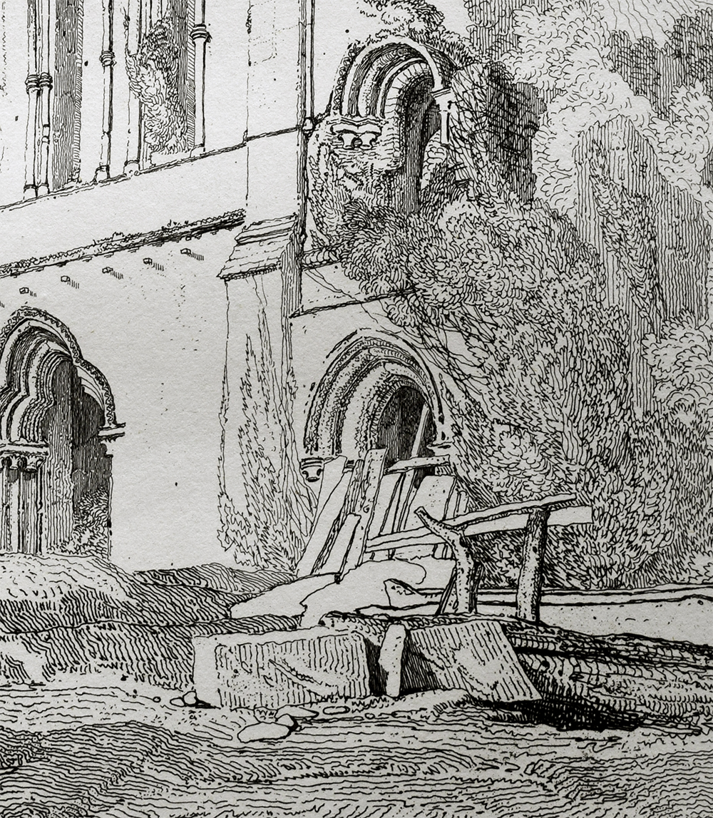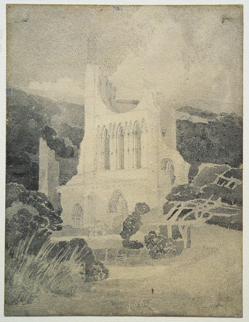 Cotman’s subject is the west front as seen arriving by road from Coxwold. The remains survive almost exactly as Cotman saw them.
