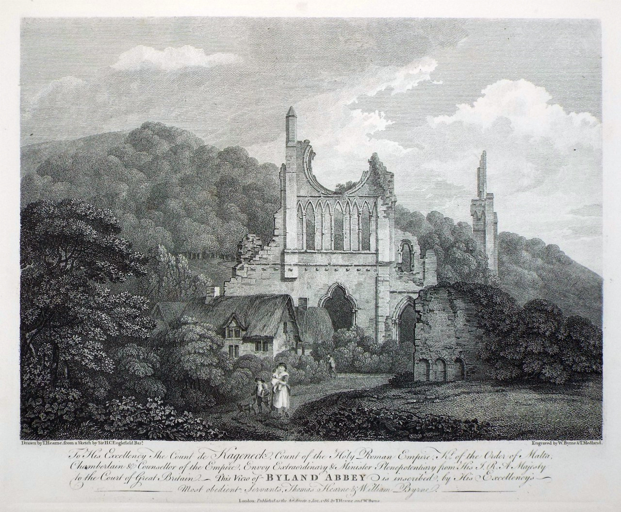 The following year Cotman elaborated the composition into a finished watercolour. The purchaser was Sir Henry Englefield who had introduced Cotman to his sister Teresa Cholmeley at Brandsby. He had a particular interest in the subject, for two decades earlier he had supplied a drawing of Byland to the artist Thomas Hearne, as the basis of a composition for Hearne’s groundbreaking series of engravings of ‘Antiquities of Great Britain’ published in 1786.