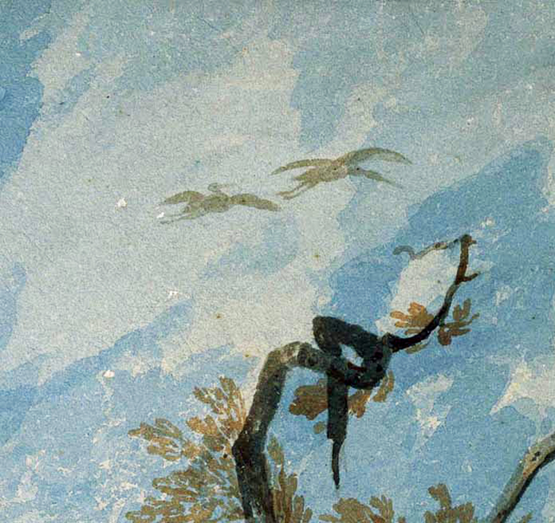 Readers will no doubt have noticed the two birds flying overhead in the Cholmeley watercolour. In his 1979 Norwich catalogue of Cotman: Early Works (no.85) Miklos Rajnai commented on them as proof that Cotman had already been exposed to Japanese or Chinese designs. That seems both significant and likely but it does occur to me that there might be some personal allusion intended. Rajnai calls the birds cranes, and my ornithology is not sufficient to challenge that, but herons would be most likely in the area today, and storks might also be possible. One does not, however, have to apply strict naturalistic probabilities to Cotman’s imagination. These birds do, after all, appear to be an afterthought and were clearly painted over an already completed sky. Storks, I am minded are traditional harbingers of childbirth. By 1811 Mrs Barbara Cholmeley had given Francis two children, the first named after his father in 1810 and the second named after her mother in 1811. Sentimental, I know, but Cotman was never reticent in such matters.
