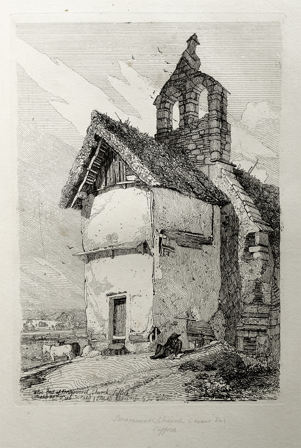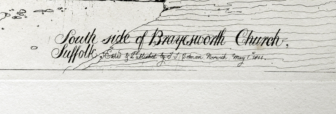 On plate bottom left of subject in cursive script, ‘South side of Brayesworth Church/ Suffolk. Etched & Published by J. S. Cotman May 1st 1811.