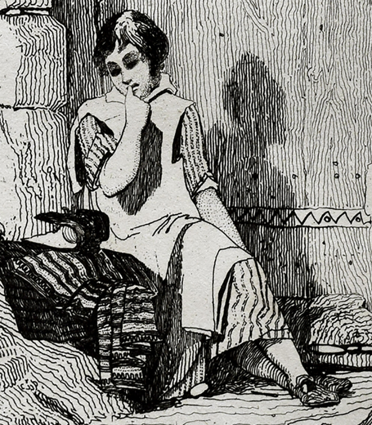 Cotman made numerous subtle changes to the detail and pose of the figure. It is perhaps most instructive to start with the feet, which are outstretched in the etching. In the drawing the figure sits more upright, and takes more weight with one leg more obviously crossed over the knee. The pose in the etching is much more at rest. The girl in the drawing seems prepared to stand up at an instant. In the drawing the figure’s left hand is visible, poised on the knee, but in the etching it dangles out of sight. As a result, there is a tension and preparedness in the drawing that is much reduced in the etching. In the drawing the figure looks out at the viewer, meets and engages our gaze. In the etching the head is downtilted, the gaze averted; indeed the eyes may well be closed. She could almost be asleep.