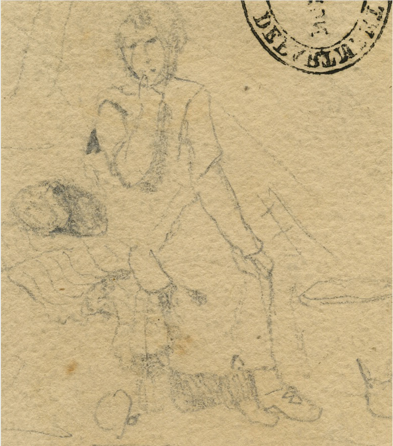As Miklos Rajnai noted in his 1979 catalogue of Cotman: Early Drawings [no.116], the figure is based [in reverse] on a sketch at the Norwich Castle Museum. It is one of hundreds of small pencil studies of figures that Cotman accumulated in his lifetime. These are now scattered across numerous collections, but would make a fascinating study in their own right. In this case Cotman need not have sketched the figure on his visit to Braiseworth, although if February 15th enjoyed clear skies in 1811, the sun would certainly have been strong enough to enjoy.