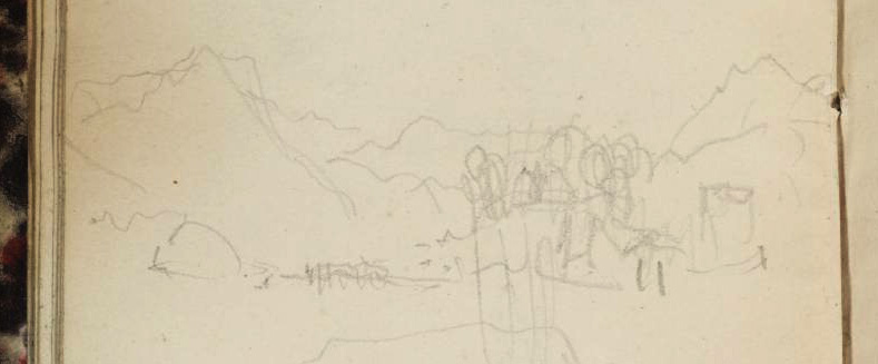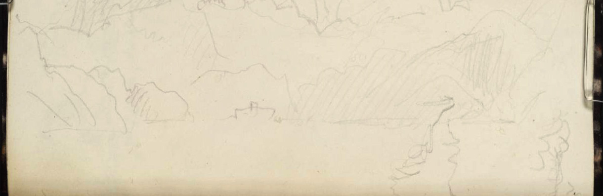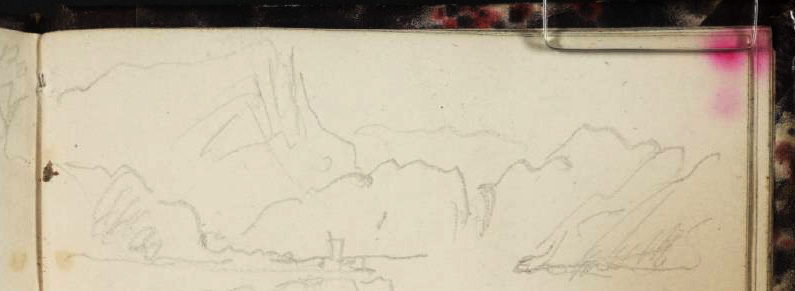 He took successive views looking east to the Rigi and Burgenstock, and looking west up the valley of the Alpnachersee with the Stanserhorn on the left and Mont Pilatus on the right. The pencil work is rapid but observant, and there is a sense of urgent, but not frantic concentration, that reinforces the impression already gleaned that he was travelling in a rowing boat, rather than a steamer. We learn from Murray’s 1838 Guide to Switzerland that the charge for boat hire to Stansstad was 1f50c for the boat and 1.50 for each man. Two men would have comfortably rowed the distance in well under two hours. The steamer fare would have been only about 1.50 but taken little more than half an hour.