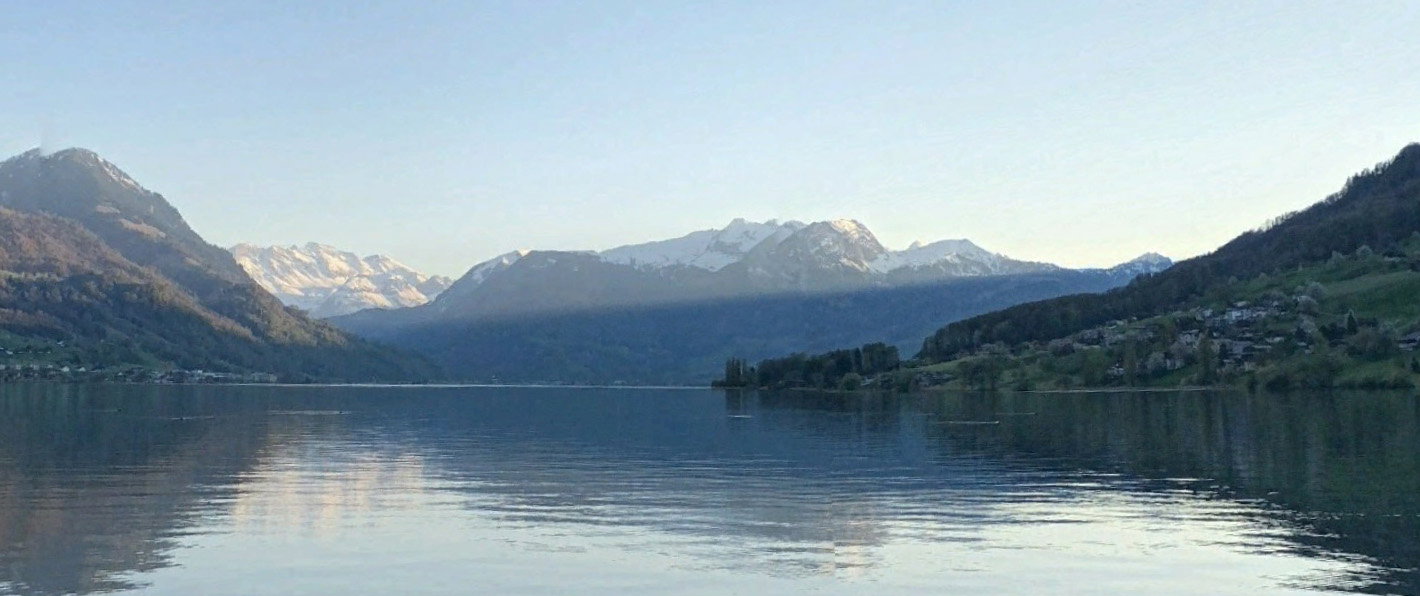 The photograph explains the diagonal lines in both of Turner’s views here of the head of the lake. The sun is now getting low in the west and is slanting in between the mountains on the right. Above the line the air is suffused with light; below it is clear in cool shade. Turner was especially sensitive to such signs of diurnal progress. He appears to have been determined to recall the effect and left himself a note ‘White line’. As we shall see, the effect did indeed lodge with him, and in time became one of the core memories of this journey.