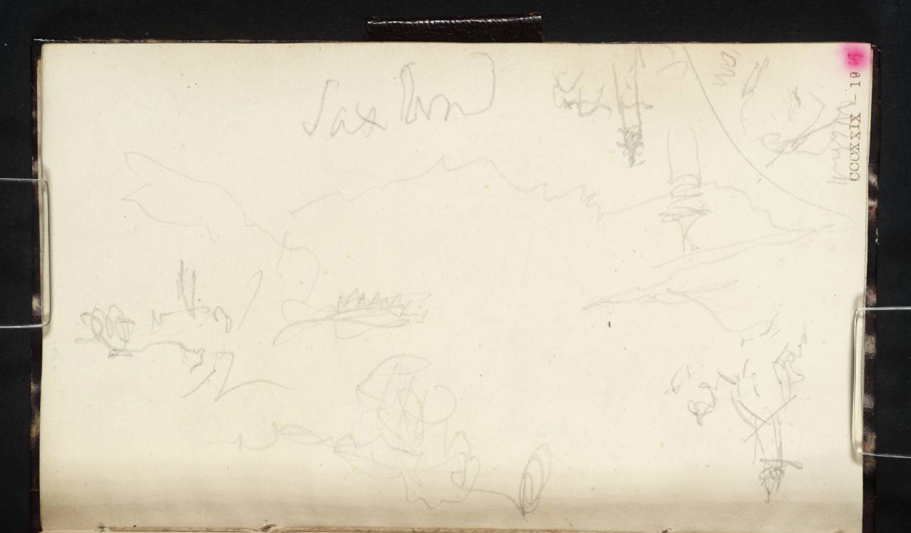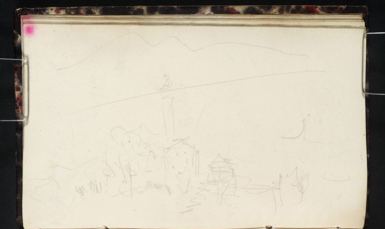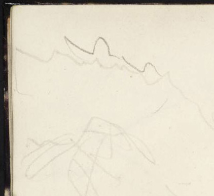 Turner had slightly more leisure to observe his subject, but still an unsteady surface on which to draw. Nonetheless his profiles make the mountains recognisable. In truth, however, the view in itself is relatively plain, and is generally only enlivened by effect. On a clear summer evening the Stanserhorn would be bathed in evening light, and the sun glinting on the peak of Pilatus. Even with only the pressure of his pencil at his disposal, and the lurching page of his sketchbook, Turner manages to leave himself a reminder of the moment, with the firmer touch of the pencil around the peak.