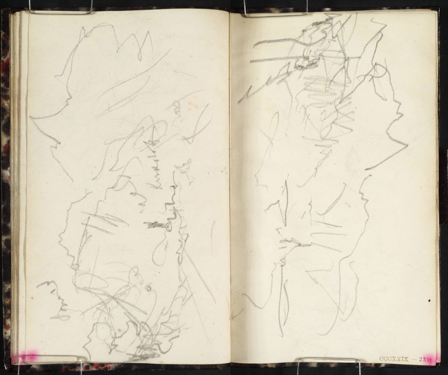 Indeed the order of the sketches in this part of the book appears as shaken up as the draftsmanship. The sequence is scattered backwards and forwards across the pages.