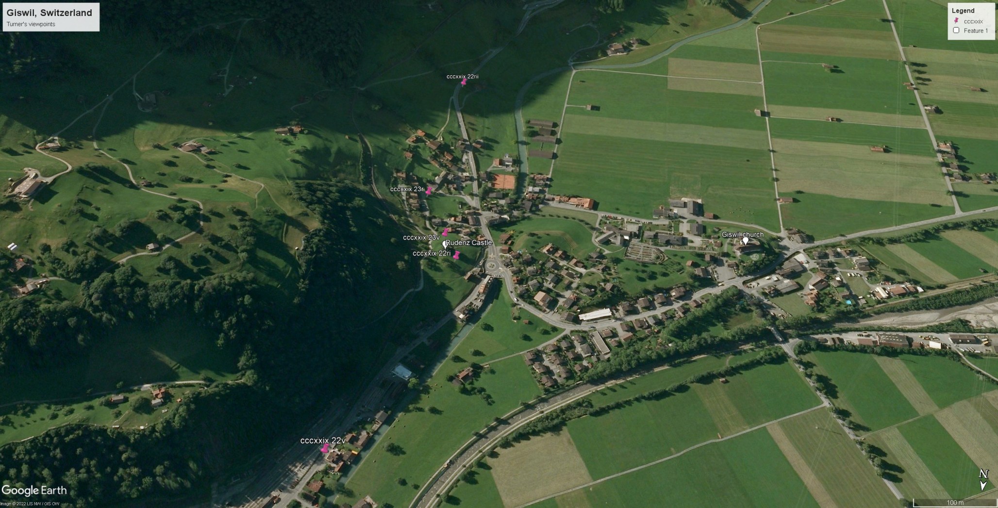 Fresh horses might have been hitched for the climb, and Turner appears to have had time to make two firmly drawn sketches of the view from close to the remains of the thirteenth century castle of the Rudenz on a mound that guards the beginning of the climb.