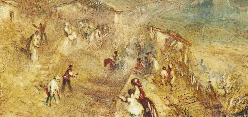 In many ways, however, this is Turner at his absolute peak – revelling in his creative potency, his accumulated understanding and knowledge, and his ability to bring this to life in his materials. The details are fascinating: At the lower left is a man on crutches, his legs dressed in emerald green making a contrast with a girl on the opposite side of the road whose stockings (or perhaps petticoats) are also green as if to contrast sprightly youth with crocked old age. Turner might well have been making a wry allusion to his own recent pedestrian incapacity with a broken knee-pan. A crowd is evidently turning out to watch some grand arrival. A horse dynamically bursts out of the dust, but it is hard to make out what exactly is following. In any case the horse represents the perfect figure of dynamic travel and vigorous being in the world. In those terms, perhaps, Turner was reduced to the sidelines, but in artistic terms his imagination was undiminished in its powers of sublime energy and vitality.
