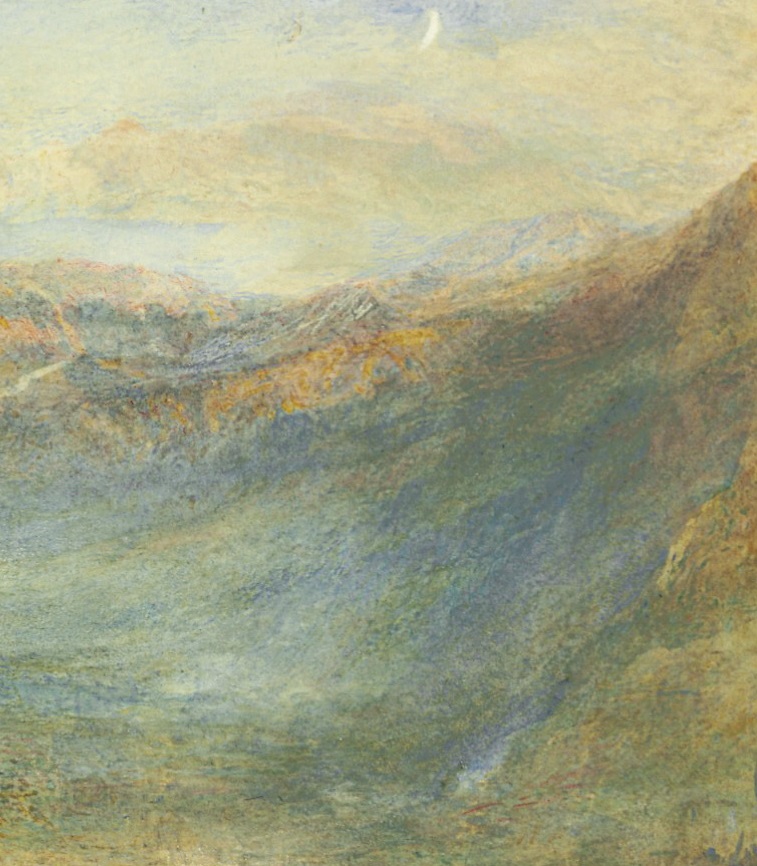 The Lungernsee yielded two other watercolour sketches. The first is at the South African National Gallery, Cape Town (1517). This records the view from the foot of the lake looking north to the Brunig Pass and Bernese Oberland. The time of day is now afternoon. The sun slants across the mountains from the right, and lights the snowfields of the Wetterhorn, due south from this viewpoint. A thin crescent moon is indicated in the centre. In 2022 a quarter moon passed through south at 17.23 on 2 August and at the same time on 1 September [see timeanddate.com website]. As we have seen in precious instalments, Turner noticed the moon making its low summer pass above the mountains at Sarnen the previous day. He also noticed the effect of sunlight slanting through the air above the Sarnersee, and this watercolour gave him the opportunity to record the substance of these phenomena in colour.