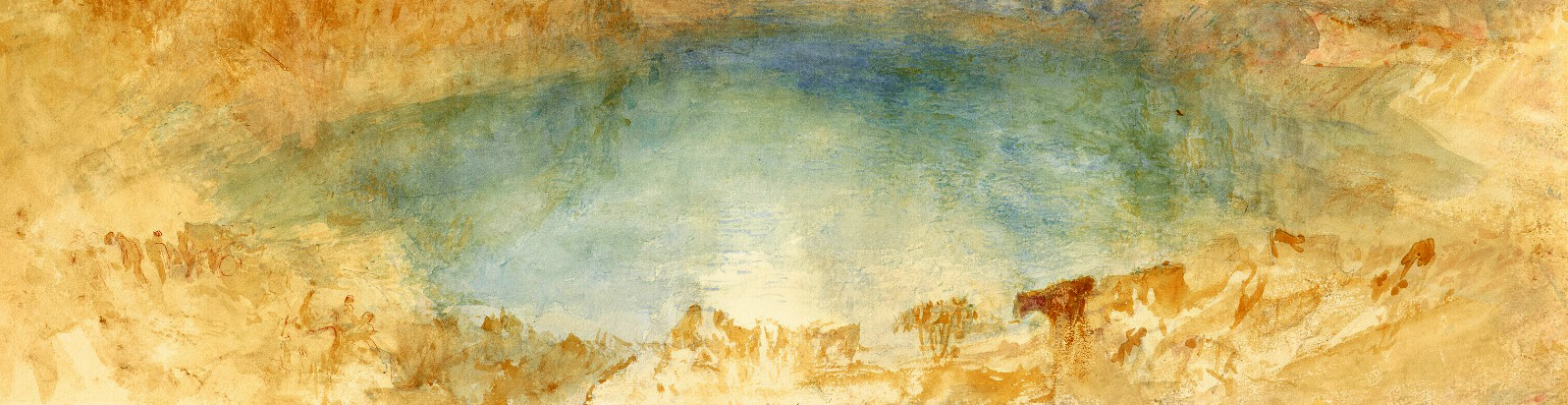 In moving from the sketch to the studio watercolour, Turner heightened the sense of tranquillity. He also elaborated the effect of the sun’s rays, and emphasised the underlying dynamic of warmth slanting into the gathering chill. The moon is made more obvious, up to about a third, its crescent given definition by the coolness gathering around it. In the foreground a string of cattle has come down to the lake to drink, and appear more than a little bemused as to how to reach the water.