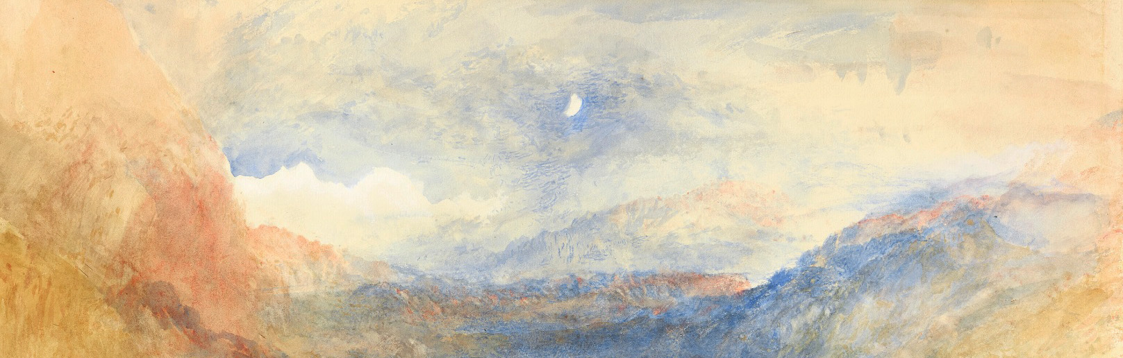 Traditionally identified as ‘The Brunig Pass from Meiringen’, the view in fact is of the Brunig Pass from the village of Lungern, with the western end of the Lungernsee to the lower right, and the church of Lungern in the middle distance towards the left. The road to the pass can be traced rising diagonally from left to right and over the pass to the right a crescent moon hangs over the distant Swartzhorn (2788m) whilst to the left the peaks of the Bernese Oberland, including the Wetterhorn (3701m), mingle with the clouds. From this viewpoint, Meiringen is on the opposite (west) side of the pass in the Haslithal. The crescent moon is in itself proof of the orientation, since it indicates a westerly view since the moon can only be in this position relative to a setting rather than a rising sun.