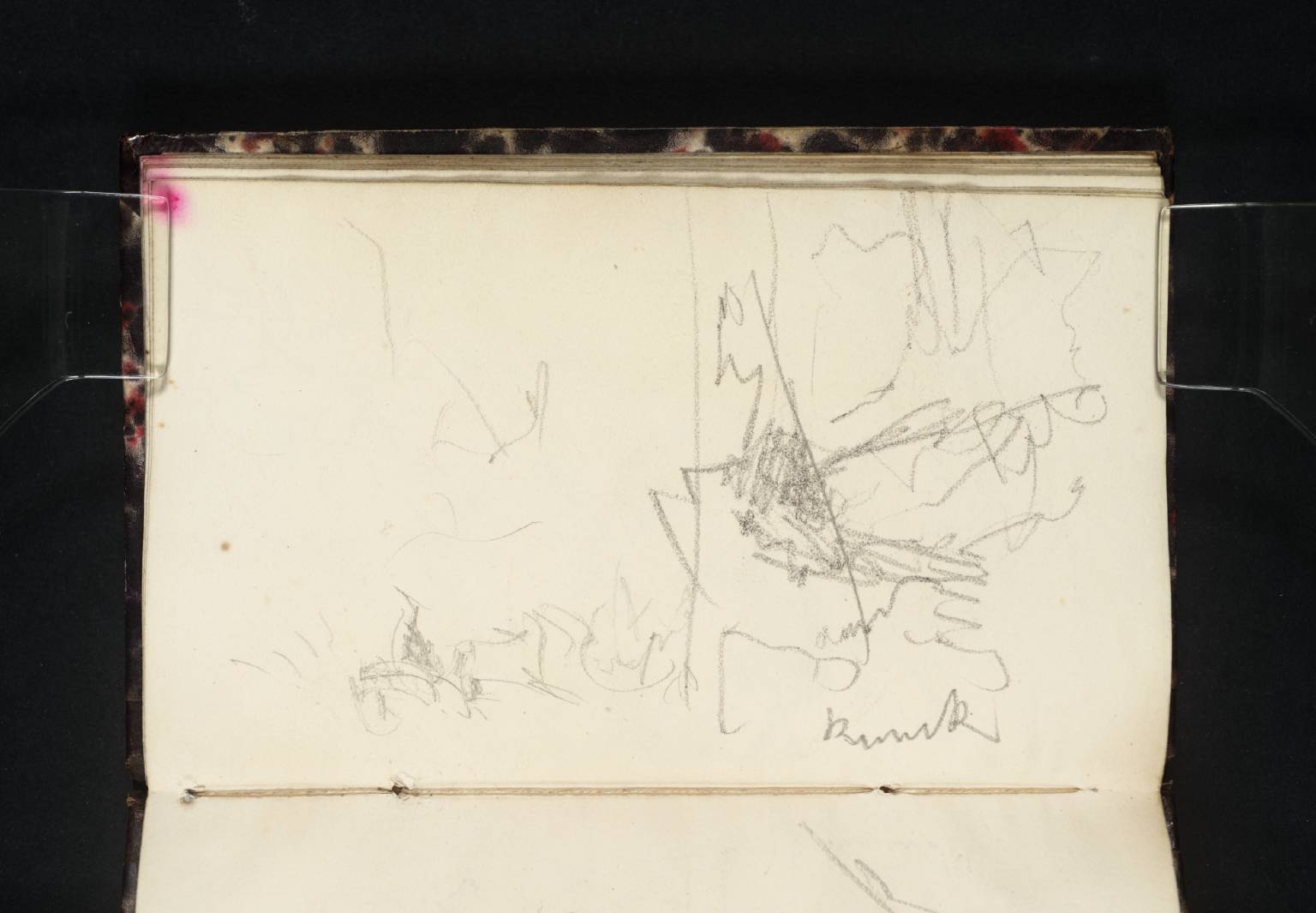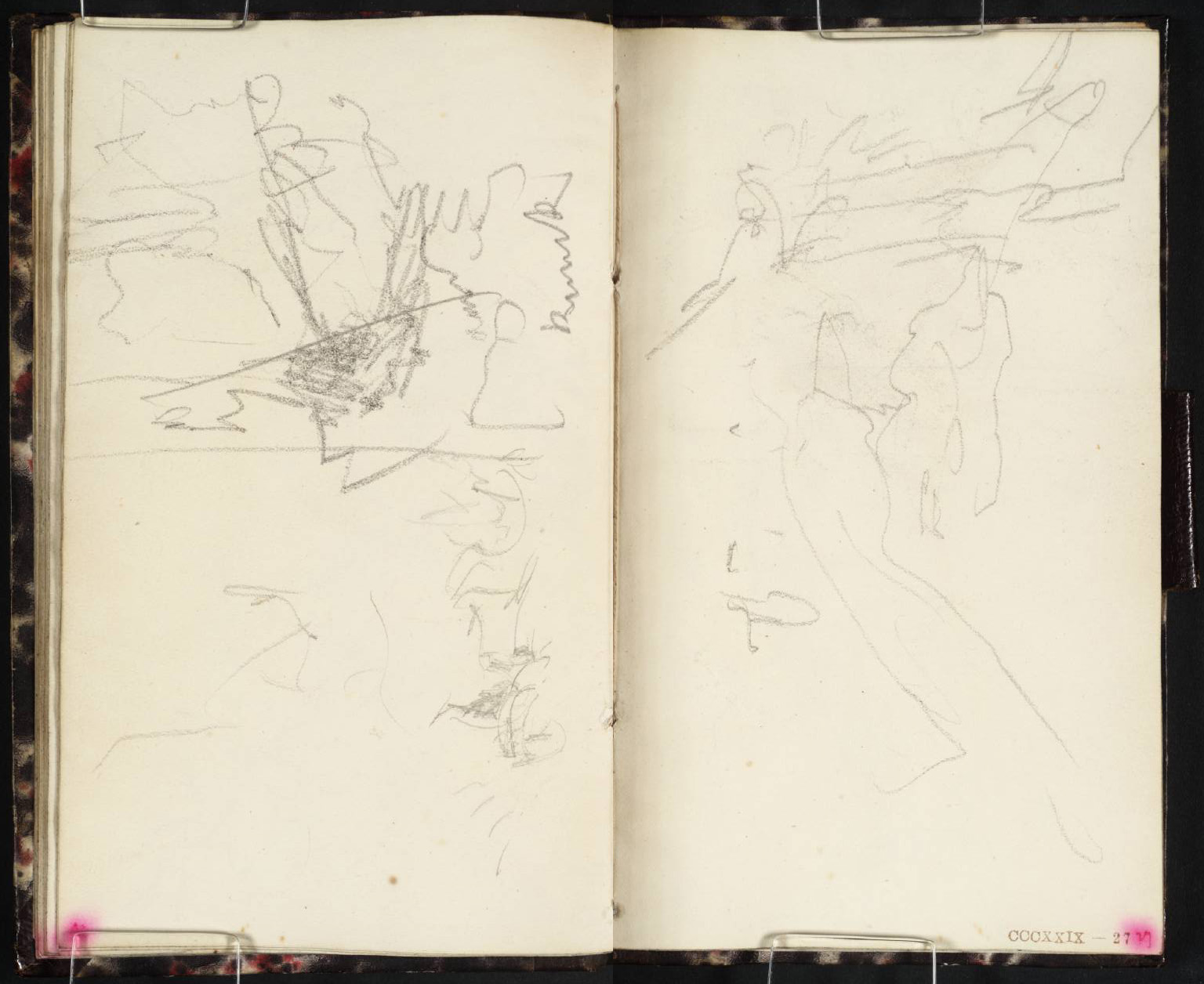 On the opposite page (f.26v) are two sketches, perhaps the two most indecipherable in the whole sketchbook. That to the left shows similar crags to those opposite, ie the Cholhuttlewald nearing the summit, but who knows what to make of the scratchings in the foreground? On the right, viewers might be forgiven for thinking the sketch mere unintelligible scribble. It might not even be possible to work out which way up it is meant to be were it not for the inscription at the bottom. Nor can we be entirely certain of that, but it does appear to read ‘Brunik’. With perseverance, however, it is possible to construe something.