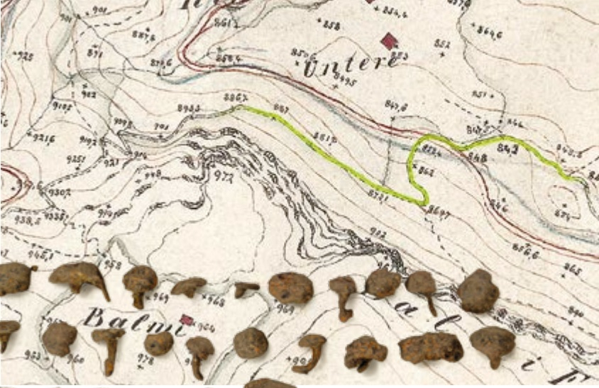 We might wonder how much luggage Turner would have carried. We may get some idea from a note in a sketchbook of 1817 (TB CLIX 101r) that he had lost a ‘wallet’ that contained a few changes of clothing besides various painting materials. In Turner’s time the word wallet was used for a long kit bag that could be carried over the shoulder. He was probably capable of carrying it himself, but might well have preferred to hire a mule or a horse. Another consideration might be his footwear. In 1844 he recorded that he wore out his boots and had to have them heel-tapped. Amongst the variety of archaeological discoveries on the route have been dozens of boot nails. It is an inevitable thought that one of them might have been cast by Turner.