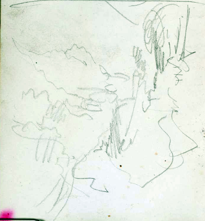 There are hilltops at the top left, and might very well be those of the Wandelhorn and Garzen. The comparison of details is close, but given that we have just seen how he drew Pilatus, we ought to be cautious at claiming such a distinct resemblance. Before the road and rail ways were blasted through, the old track climbed to the gap to the north of the present station. This sketch might very well record a first glimpse of peaks on the far side. After a climb of 350 metres, the artist might very well be expected to express the effort in his calligraphy.