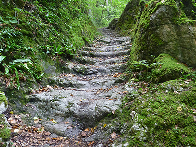 The old route picks its way up through trees to the base of the first limestone escarpment, the Hagsflue, where there is an ancient flight of steps cut into the living rock. There are a few sketches which might record the locality. The first is a few pages forward on f.27v, as if the artist turned over a few blank pages in haste.