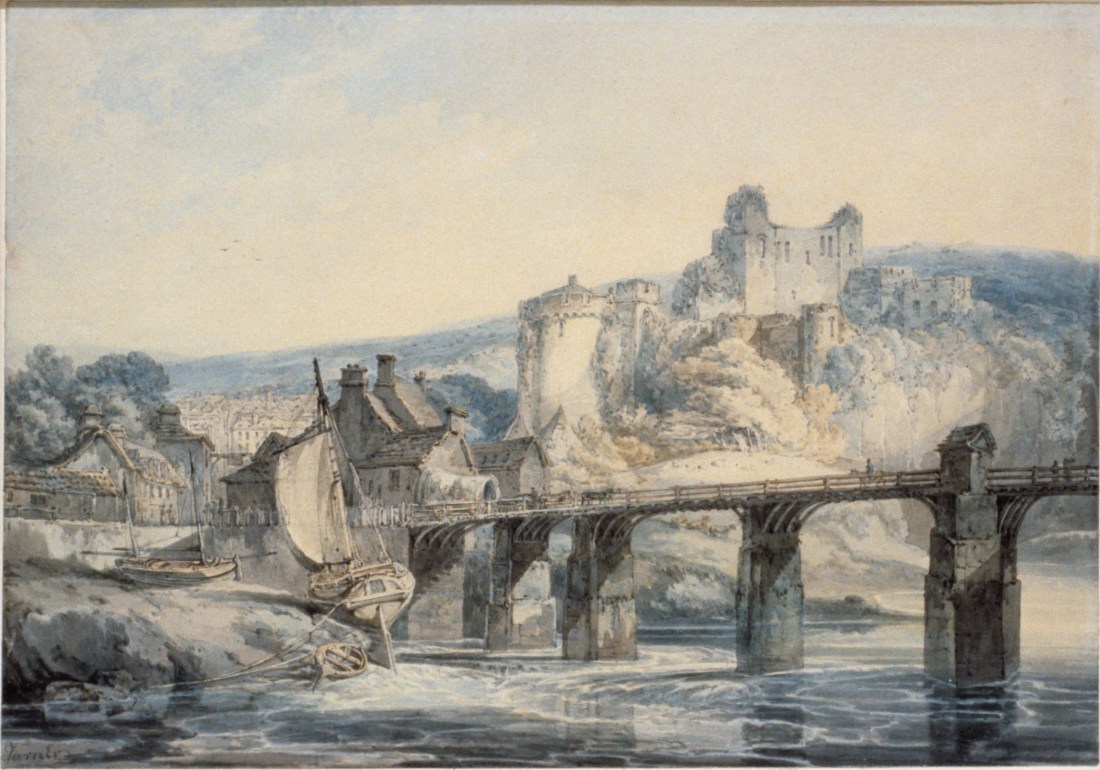 The subject is Chepstow, Wales, as seen from the north across the river Wye. The scene is recognisable today, albeit somewhat interfered with by the growth of trees and modern building, but the bridge shown by Turner was replaced in 1816 by one of iron, which has survived to celebrate its recent bicentenary.