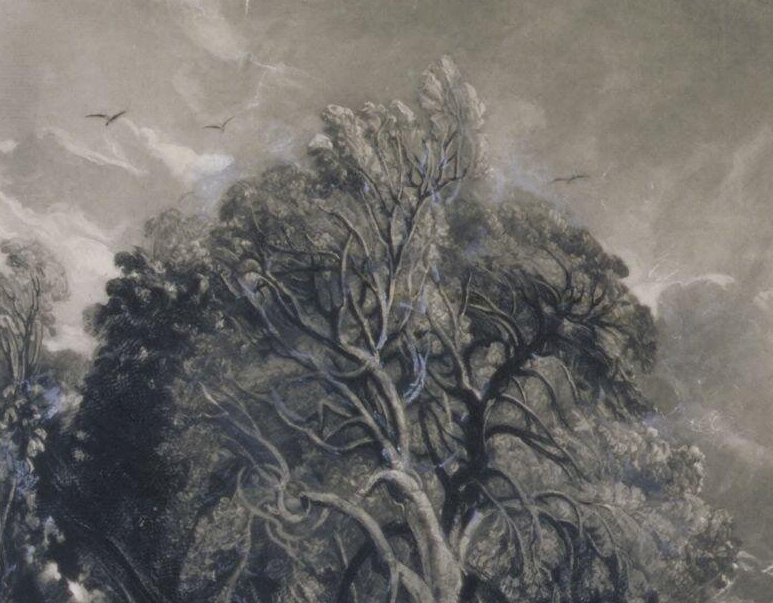 The alterations to the tree went rather further than ’a few lights’. The whole canopy behind the knot of boughs to the left is darkened, right the way up to the top edge. Similarly to the right the large canopy is considerably darkened and much more depth and contrast put into the background foliage all the way down to the ground. The ash reaches perhaps the peak of its affective dramatization at this stage.