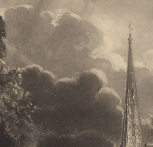 [Lucas darkened the sky beyond to achieve more contrast. If he altered the tower or gable itself that is lost by Constable’s vigorous scratching out in the V&A proof].