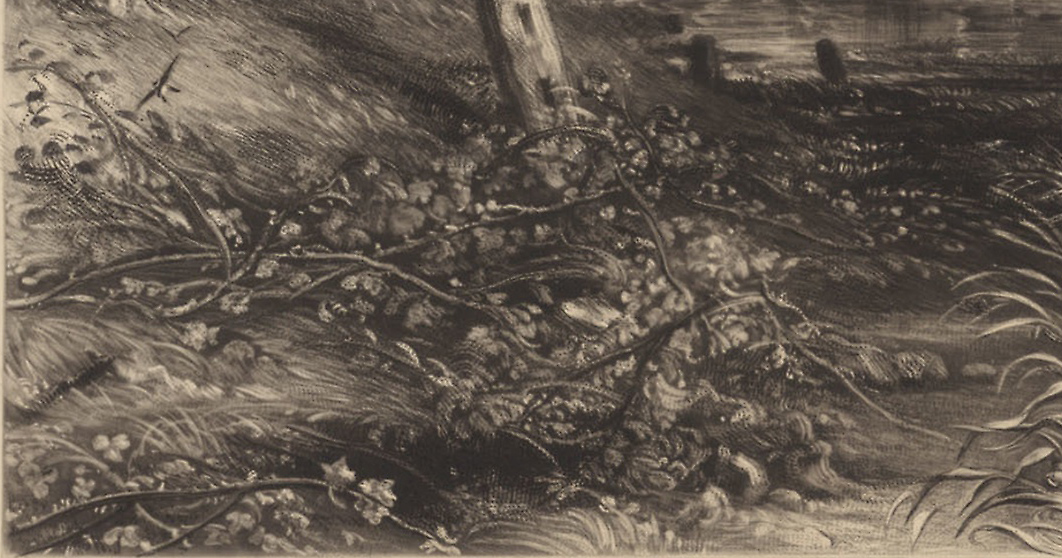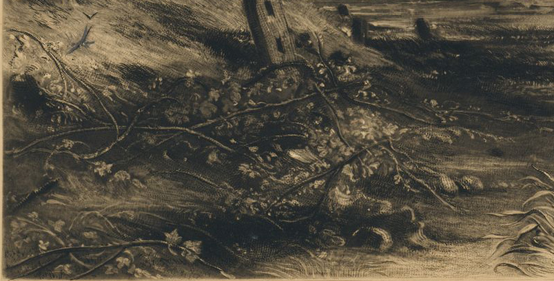 It is not at all clear why the alteration of plants was ‘famous’. Possibly it had been the subject of some discussion between artist and engraver. Looking back through the various states, we can see that there was new work at the lower left between states 01d and 01d (i), gaining somewhat in beauty and frothiness of effect, but none between states 01d (i) and (ii). Looking between 01d (ii) and the V&A worked proof 01e (i), we can see that Lucas had already reworked this area to give a sense of long grass growing beneath the brambles and indeed extending beyond along the bank. Constable was here looking for further clarification of that, and we can see in the next state that Lucas did his best to comply. The alterations might have been ‘famous’ in that Lucas had been reluctant to meddle with an area that was already rather beautiful. Certainly we may wonder why Constable was so concerned to interfere. The precise botanical definition was obviously significant to him. Long grass and plantains would signify late summer, reinforced by the overgrowth of brambles. Constable obviously wanted to be specific about, and botanically appropriate to a particular time of year, which in this case would be the late summer. The most recent commentary on the painting by Amy Concannon and John Thornes has argued that Constable set the date at 25 August 1832, to mark the death of Archdeacon John Fisher.