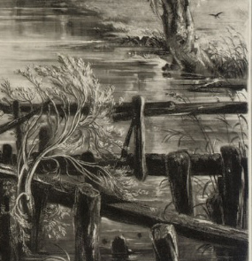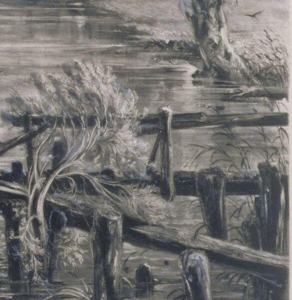 Light on posts, & rails, & making a good angle line – to assist by its diagonal, the level, or horizontal line of meadow, water &c &c. Water up to foot of dark posts attended to carefully.