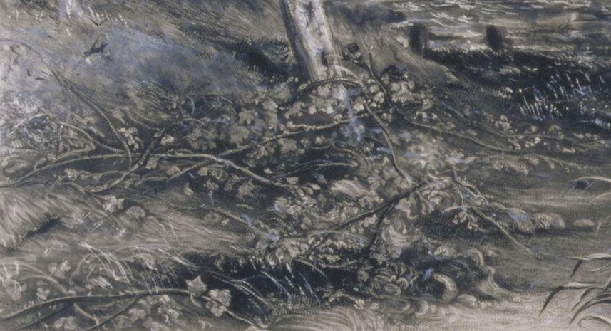 Constable worked over the lightning bolt with some quite vigorous scratching. Lucas seem to have taken Constable’s intention to broaden the brightness of the track a little, and to increase its contrast against the dark cloud behind.