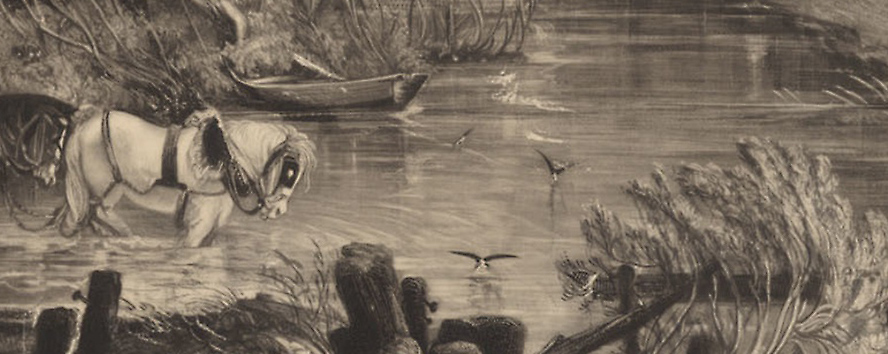 Lucas’s reworking of the surface of the water is one of the triumphs of the plate. The general darkening allows him to give much greater depth of effect and variety of tone than before, and to introduce the very beautiful detail of the concentric ripples radiating from the legs of the lead horse. The stump below the head of the second horse is lit down both sides, which gives a sense of parallax. It is hard perhaps to see that the man and boat have been improved significantly. There is a new stroke that seems to represent the starboard gunwale, but this is dropped in subsequent impressions. The willow growing over the rails to the lower right is given more substance and detail, and now contrasts more with the darkened water beyond it.