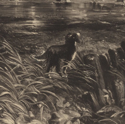 This is a little difficult to construe, but the ground above the dog’s back is darkened and given a little more texture.