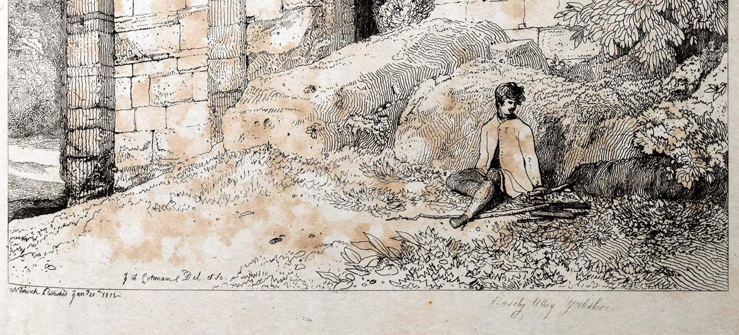 Inscribed in plate, lower left centre, inside margin line) ‘J S Cotman Del et Sc’, and below the margin line, lower left: ‘Norwich. Published Jan y 20th 1811’. Also inscribed to the right below the margin line, in a rather faint script ‘Easeby [sic] Abbey Yorkshire’.