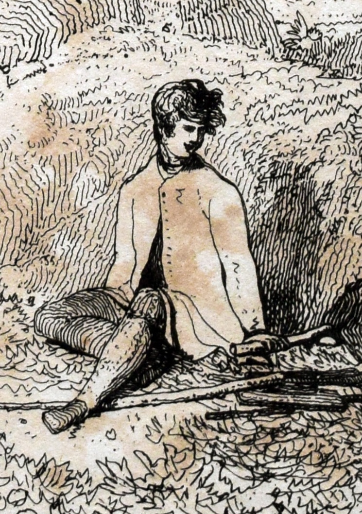As is commonly the case, Cotman introduces a figure into his composition. In this case he gives us a young man apparently in his late teens or early twenties, wearing his hair fashionably tousled. He is dressed in a collarless jacket and breeches. The jacket is perhaps somewhat old-fashioned. The favoured style of Cotman’s gentlemen contemporaries was for coats and jackets cut away at the front, to show off the breeches. This buttons right down the front, is possibly made of leather, and even if woollen cloth would at best have been considered practical wear. It would have proved useful, if intending to be out for any length of time.