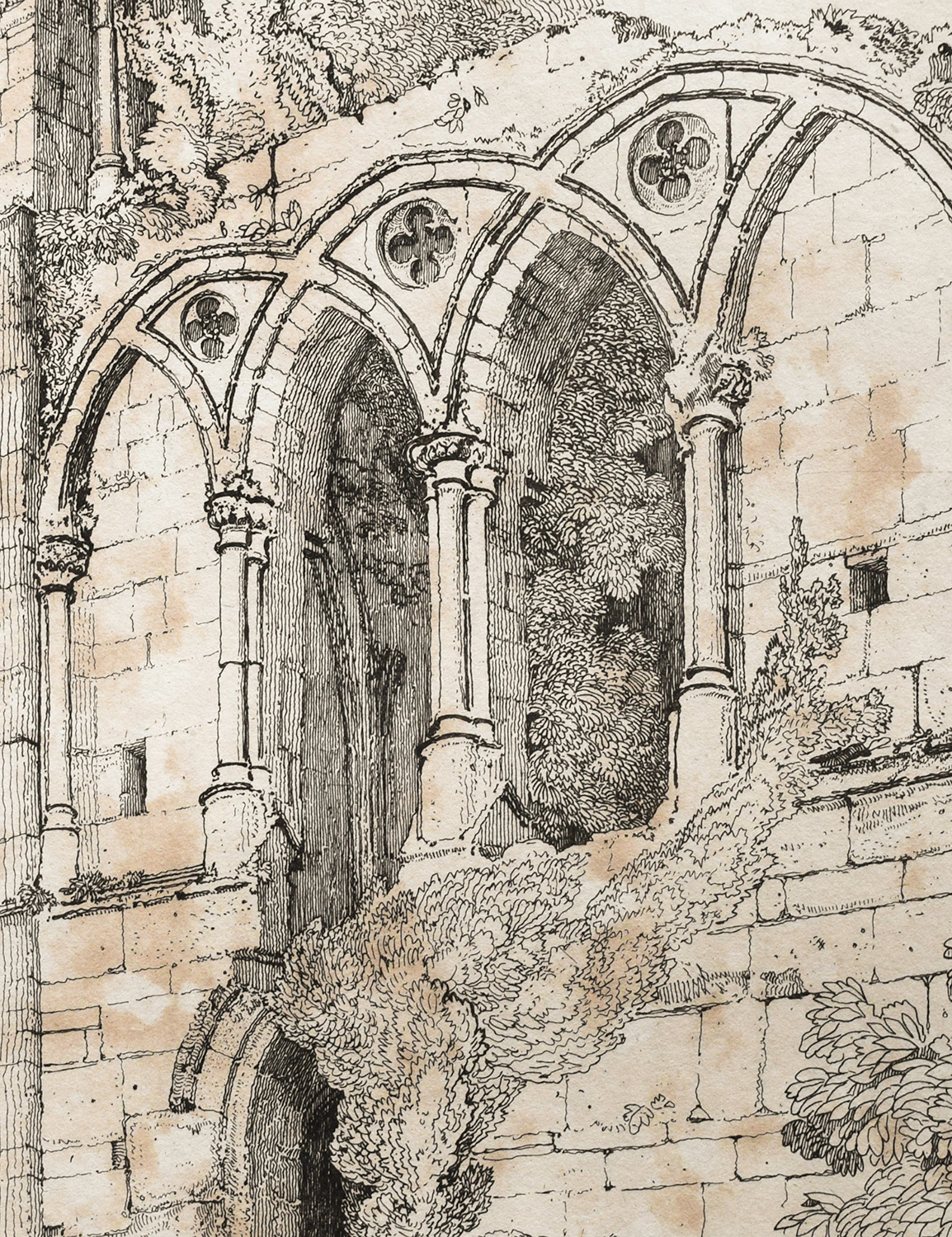 Given the extent of the remains, and the variety of subjects that the site offers, it seems obvious that Cotman must have sketched a number of subjects at St Agatha’s. We may wonder, then, quite why he selected this. Despite that lack of detailed archaeological information, there was a growing interest in the history and development of medieval architecture. Antiquarians up and down the land were visiting such sites and attempting to develop a sense of the origins, chronology and dissemination of architectural styles and motifs. Cotman’s home county was particularly fertile ground for such work, and the artist already enjoyed the patronage of one of Britain’s leading antiquarians, Dawson Turner of Yarmouth. Turner had already bought several of Cotman’s watercolours of architectural subjects, including a large watercolour of Fountains Abbey (see plate 19), and Cotman engaged keenly with his patron’s knowledge and interests.
