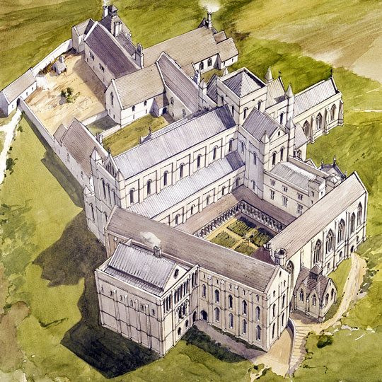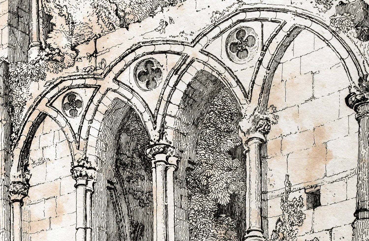 The key element of his composition is the very fine range of interlocking arches that form two large windows. When Cotman visited almost nothing was known about the functions of different buildings at St Agatha’s, except for the church and cloisters. That knowledge had to wait for scholarly investigation in the later C19 and even modern research has numerous unresolved questions.