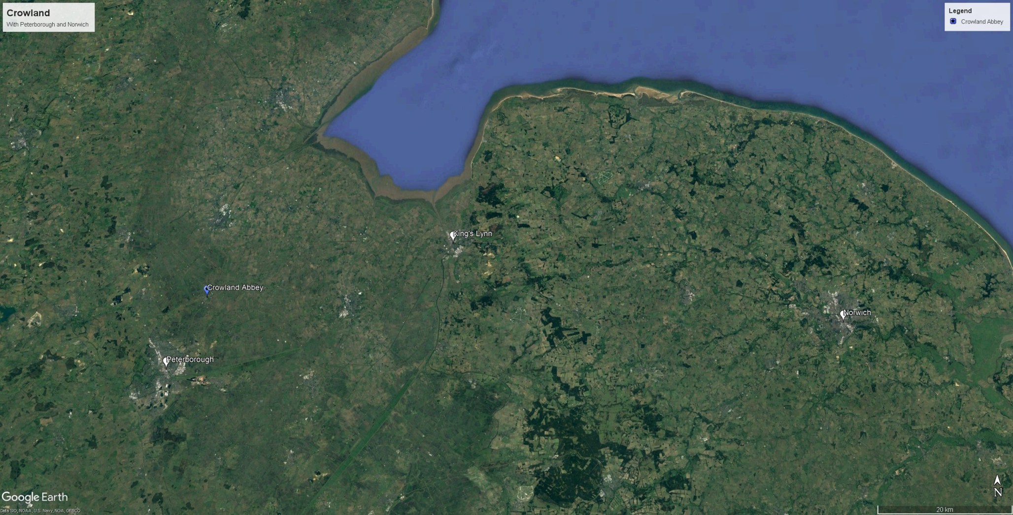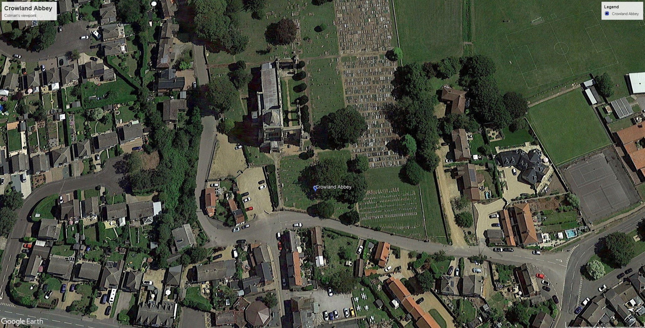 Crowland Abbey is about eight miles north-east of Peterborough. The spelling is somewhat confusing. The abbey has long been given as Croyland, whilst the village as Crowland. Cotman calls the abbey Croyland and that spelling persisted at least until the 1999 edition of the official guidebook but since then the church has aligned its spelling with the village.