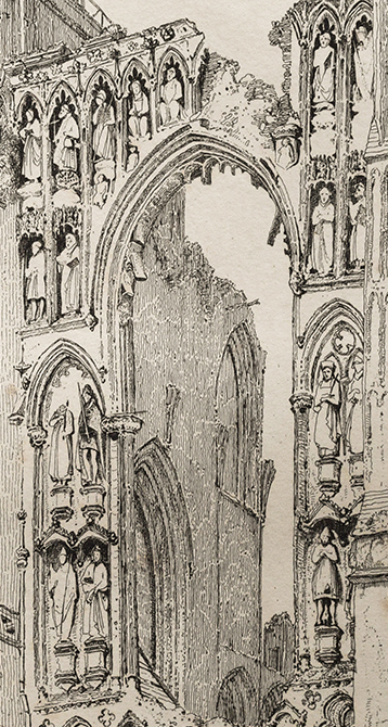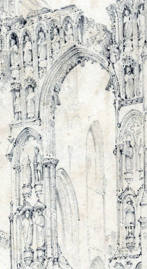 Notwithstanding that, it seems hard to imagine that Cotman’s depictions of the sculptures would have satisfied the scientific scrutiny of the Botanists worried about in his letter from Crowland (see above, part #1). Understanding the figures in the round, however, first requires the ability to see them in the round, and that would require scaffolding or more latterly a cherry-picker, a drone, or even a Lidar scanner. It is perhaps not surprising that the first proper systematic visual record was not accomplished before the photographs published in Jenny Alexander’s article in 2014. Cotman’s drawings and etching represent much more the beginning of an interest rather than the end. They are part of a movement to popularise interest in such things that was begun in the eighteenth century. In putting his artistic talents in the service of architectural antiquities he invested our experience of these subjects with imaginative and emotional appeal. It is sufficient that his characterisation of the architecture and sculpture is powerfully suggestive that each element would reward greater familiarity and engagement. The investment was slow, however, to provoke real effect. Apart from some emergency shoring-up, Crowland continued to moulder until the 1860s when proper restoration work began. Cotman, however, may be given some credit for being in the vanguard of a movement that shaped the impulse to conservation. His originality in a nutshell, is to have shown how such a subject might look when viewed through a lens imbued with feeling.