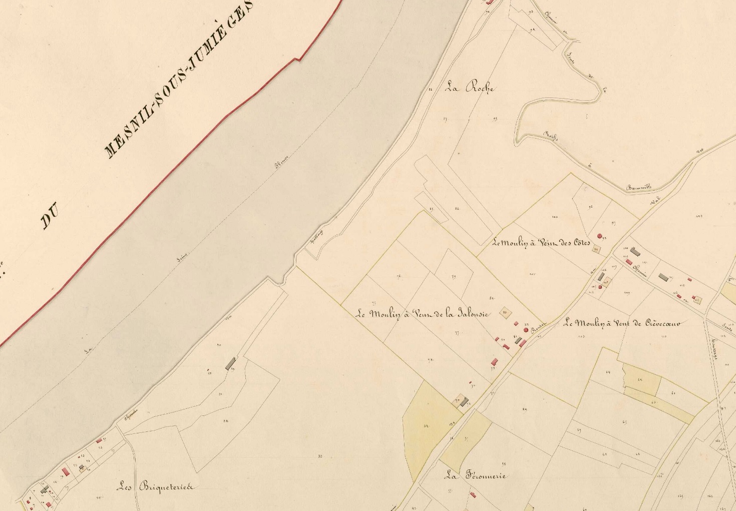 The Normandy Heritage site (Inventaire patromoine normandie) records: ‘The windmills of Côtes, Jalousie and Crèvecœur are shown in section B of the 1826 land register. They were all three located a few dozen or hundreds of meters apart on the heights overlooking the Seine. The windmill of Jalousie, destroyed in 1863, had belonged to the Saint-Georges de Boscherville abbey since 1203. The windmill of Côtes, which was located at the current site of the panorama, was destroyed in 1850. The millers’ houses still exist on the other side of the Côtes path. The Crèvecœur windmill, built near the current pond, was destroyed in 1879.’