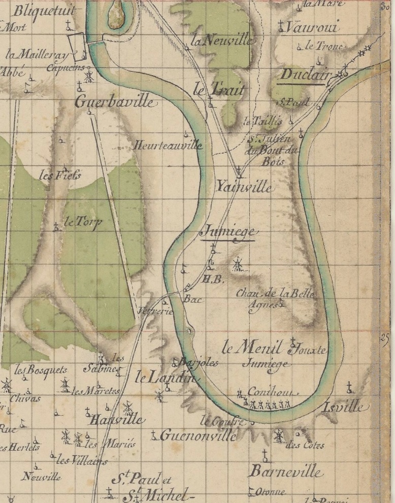 We can identify the windmill. It stands in the vicinity of Barneville sur Seine. There is a well-known belvedere here now offering an astonishing panorama of the entire Jumieges meander and the encircling ramparts [photgraphed by Edward Tap for Google Streetview]. No windmill survives in this area today, but there is one in the right vicinity marked on an ?early C17 map at ‘des Cotes’: