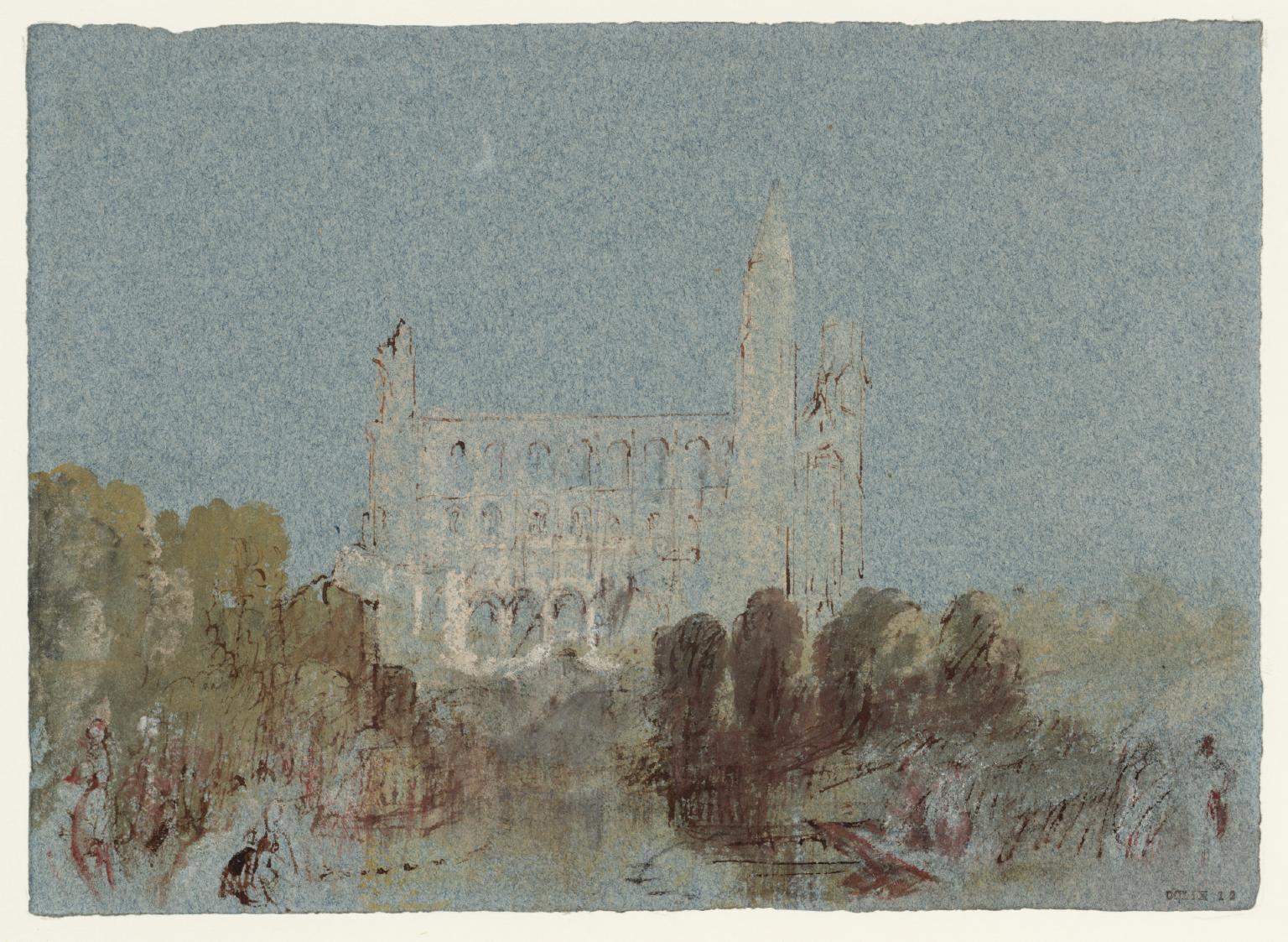 Turner made three watercolours of Jumieges on blue paper, one of which was engraved for Turner’s Annual Tour published in 1834. These belong to a large group of watercolour studies on blue paper made in connection with his explorations of the rivers Loire and Seine. Of these, sixty-one Seine subjects were engraved and twenty-one of the Loire. The engraved subjects vary in degrees of elaboration and despite the efforts of Ian Warrell and others, many remain unidentified. The situation is further complicated by the fact that there is an almost equally large number of blue paper studies in pencil or in pen and ink. Most commentators have assumed that the blue paper watercolours are derived from the pencil sketches in the sketchbooks (see part #2) but that is plainly not so in many cases, and the pencil studies seem ipso-facto to have been done on the spot. There is a major topic here for further research, but for the time being we may at least assess the material relating to Jumieges.