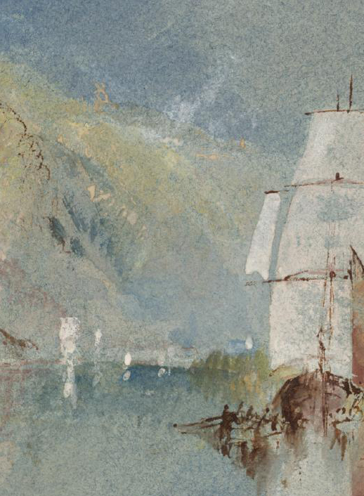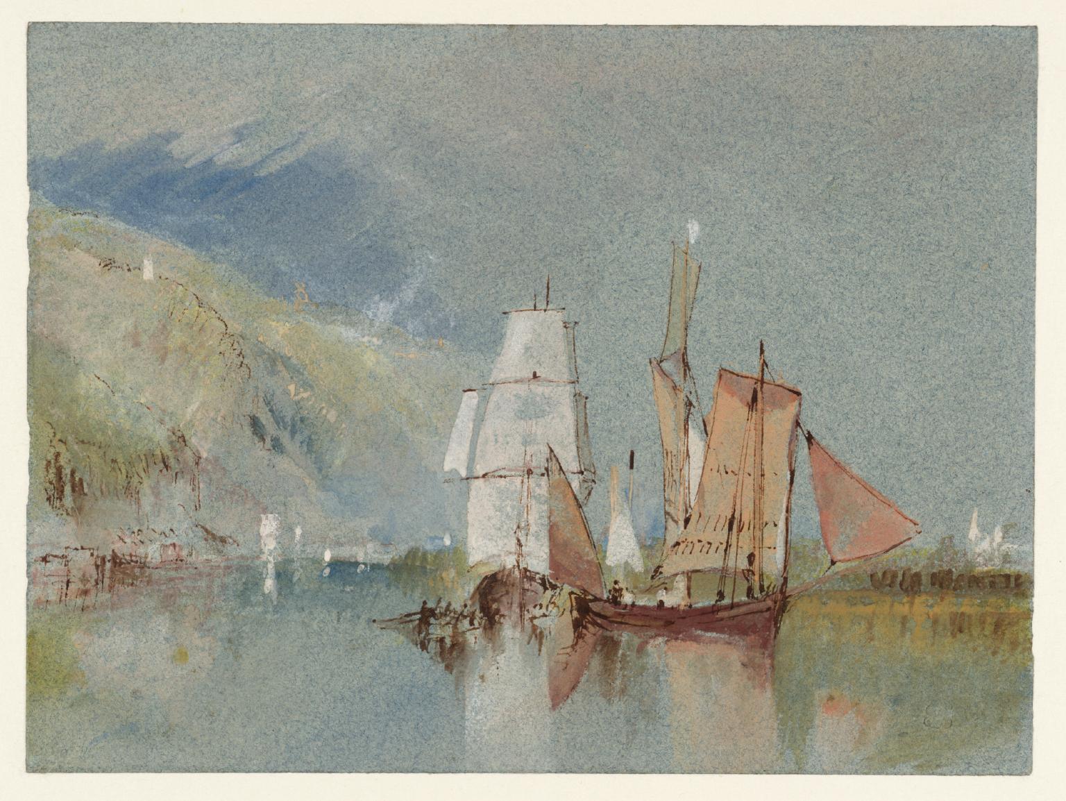 Turner has dramatized the height of the left bank, but his principal innovation is the introduction of the shipping. The handling suggests quite animated conditions, with the sun slanting in over our left shoulder. One might at first think of blustery, fitful weather, full of passing showers, except for the fact that the ships are clearly struggling for any breath of wind. The vessel in front to the right is a three-masted ketch, flying just about every square yard of canvas that it can hoist. But for all that there is barely any pressure on the sheets.