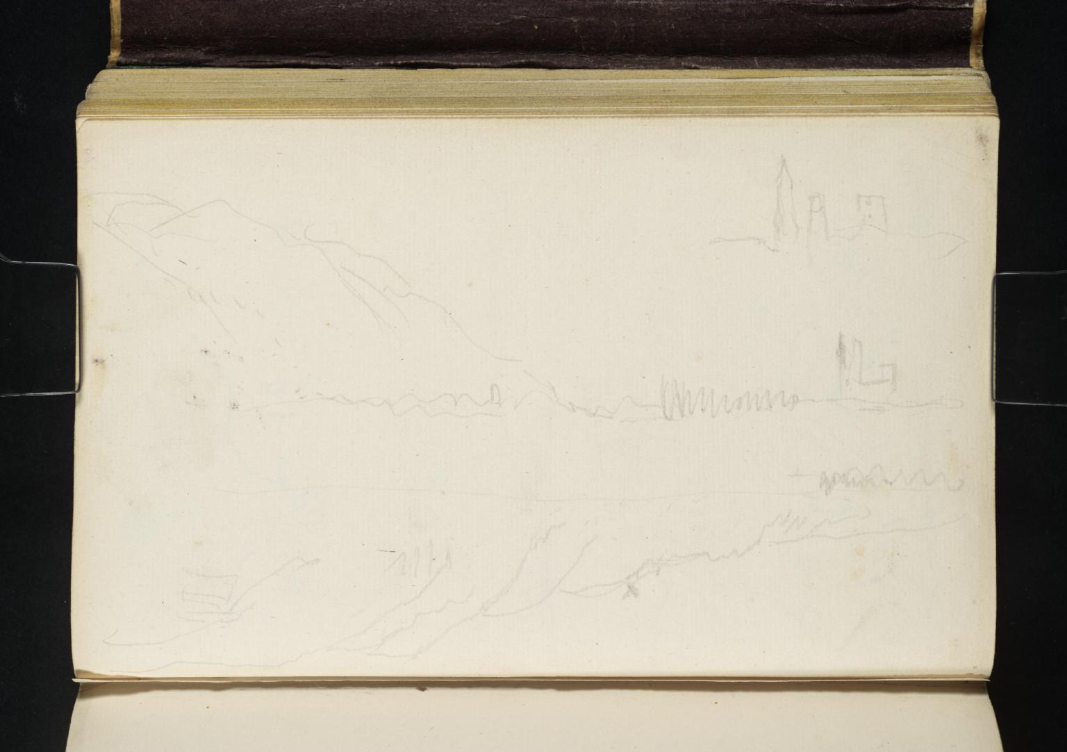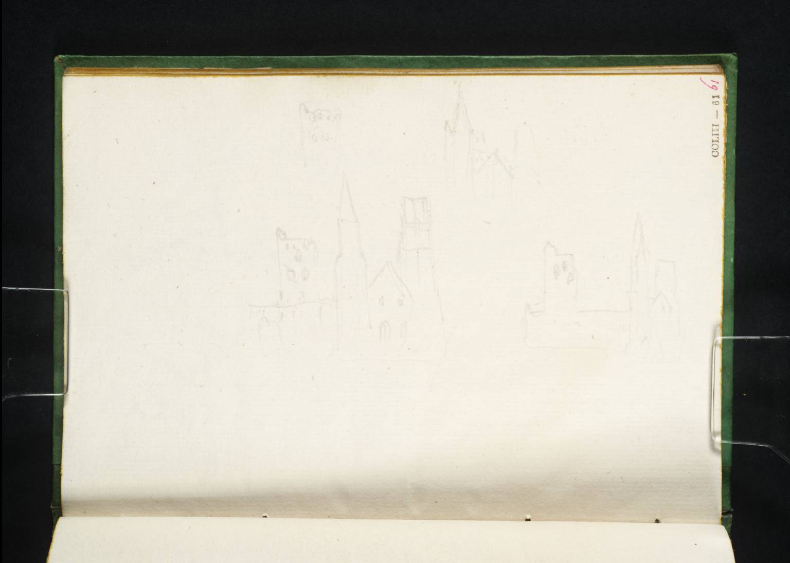 The second watercolour is a study of shipping on the river, with some licks of white paint at the left that suggest a distant view of Jumieges Abbey. The indications are slight, but we can perhaps make out the north-west tower with its spire to the left, the shorter south-west tower to the right, and the gable of the west front between them. We might wonder where the crossing tower might be, possibly just out of frame to the right, but in general we can infer a viewpoint to the south west, and there is a close general similarity between the indications here and the pencil sketches of this stretch of the river in both sketchbooks TB CCLIII 61v and TB CCLIV 69v, particularly with the latter. The correspondence is close enough for the later to have provided a basis for the watercolour.