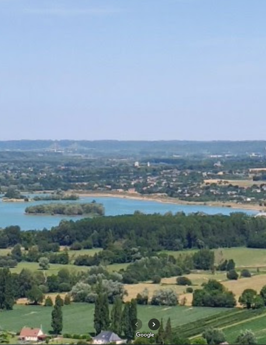 Surprisingly perhaps, given that this is the subject selected for engraving, this is the most difficult of the Jumieges watercolours to elucidate in terms of its topography. The form of the abbey is rather dashed-in but the north-west tower with its spire appears to the right of the shorter south-west tower. This establishes a viewpoint on the river slightly to the east of due south. Any such viewpoint would be over three miles distant. Google Earth has a streetview panorama by Edward Tap taken from the Belvedere de Barneville sur Seine – and even from such high ground at the edge of the escarpment the abbey is but a couple of specks. The distance implied by the watercolour is clearly much less than that, so must be imaginary. The river appears to pass to the right of the abbey instead of the left. Nor, in any view from the south is there any rising ground on the right bank of the river such as that depicted here, still less any church spire that might appear above the trees.