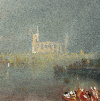 It is perhaps worth giving some pause to wonder how Turner carries this off. He salvages sufficient recollection of the distant prospect of the abbey to render it recognisable and he remembers the sweeping bend of the river, wooded banks on one side, flat ground on the other. This rather begs the question of what we truly remember of anywhere. Nowadays we tend to let photographs do the work for us but our native memory tends to be anything but scopic. It is fragmentary, coloured by feeling, circumstantial, subjective and idiosyncratically selective. Before photography (stirring into being in the 1830s, but not widely established until the 1840s) it must have been rare to hold up an image before its supposed site. When Leitch Ritchie explored the Loire and Seine to make his notes for Turner’s Annual Tour he did so armed with a packet of proofs of the engravings. As Ian Warrell points out (Turner on the Loire, 1997, p.194) he was thus one of the very first to so travel In Turner’s Footsteps.