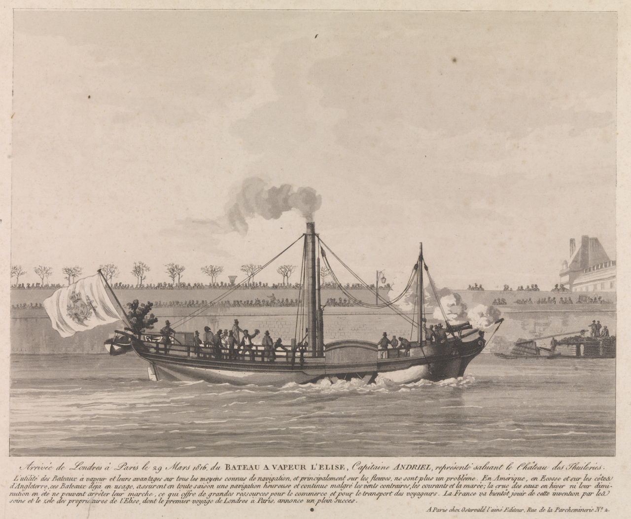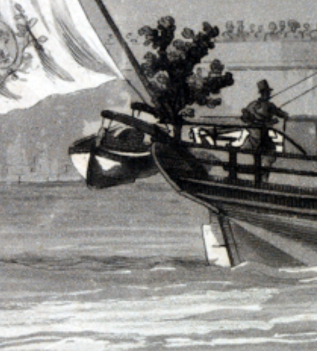Even the very early steamboats were substantial vessels. It will probably be impossible to be certain which specific steamboat Turner has in mind, but the details correspond to those of the Elise. She was one of the most famous of the early steamboats on the Seine (full history given here). She was built in Dumbarton on the Clyde in 1814 and did service as the ‘Marjory’ on her home river before being transferred to the Thames. In 1816 she was sold, renamed the ELISE and on 17 March became the first steamer to cross the English Channel. She sailed from Newhaven to Le Havre and then up the Seine to Paris where she arrived to great acclaim on 29 March. The engraving above was issued to mark the occasion. She served several years on the Seine and evidently ended her days there. On source says that part of her hull was still visible on the banks of the Seine as late as 1888. We cannot say that the stern in the watercolour is certainly that of the Elise, for there were several other paddle steamers on the Seine by the later 1820s, but Turner’s and the Elise are near-identical. It remains an open question as to what was Turner’s source for these details. He might well have taken them from an engraving.