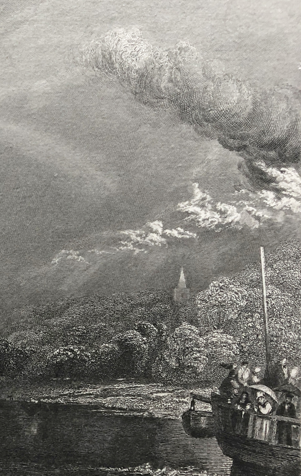 Ruskin’s observation is rather beautiful and not a little important, yet manages to overlook the obvious. The steamboat, though a principal character in the play, is ostentatiously performing its part off stage. It is a bold and unusual pictorial device. There might be comparable pictorial examples, particularly in cartoons, but in mainstream art, particularly that of landscape it is certainly rare, if not positively outlandish.